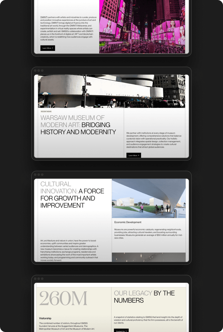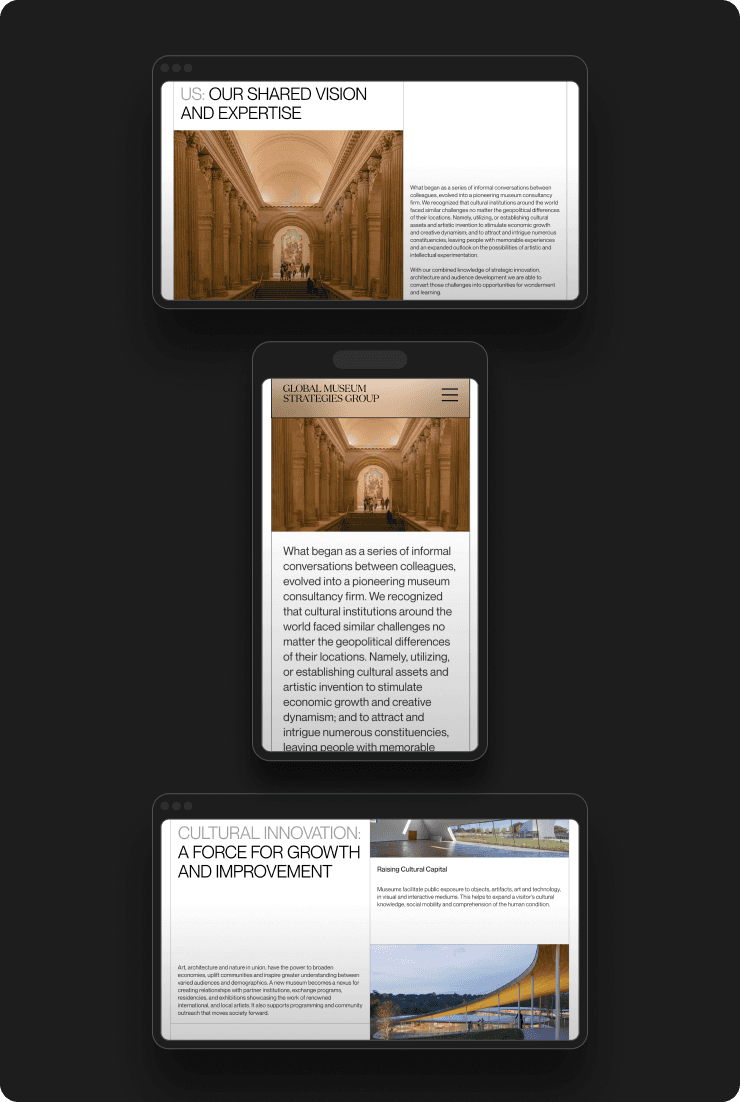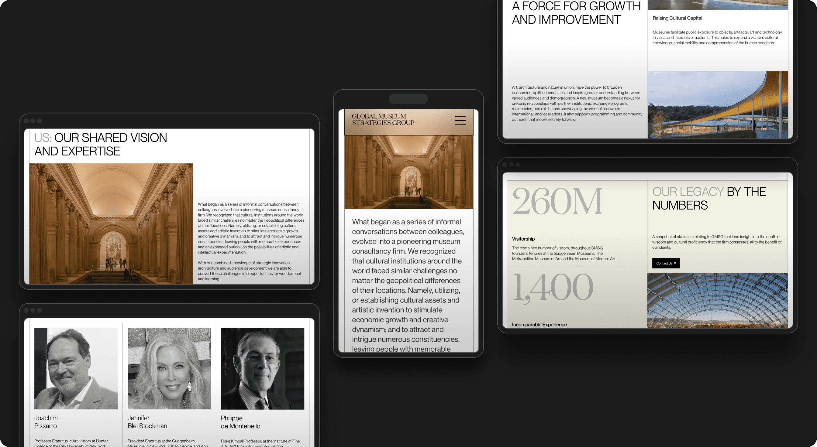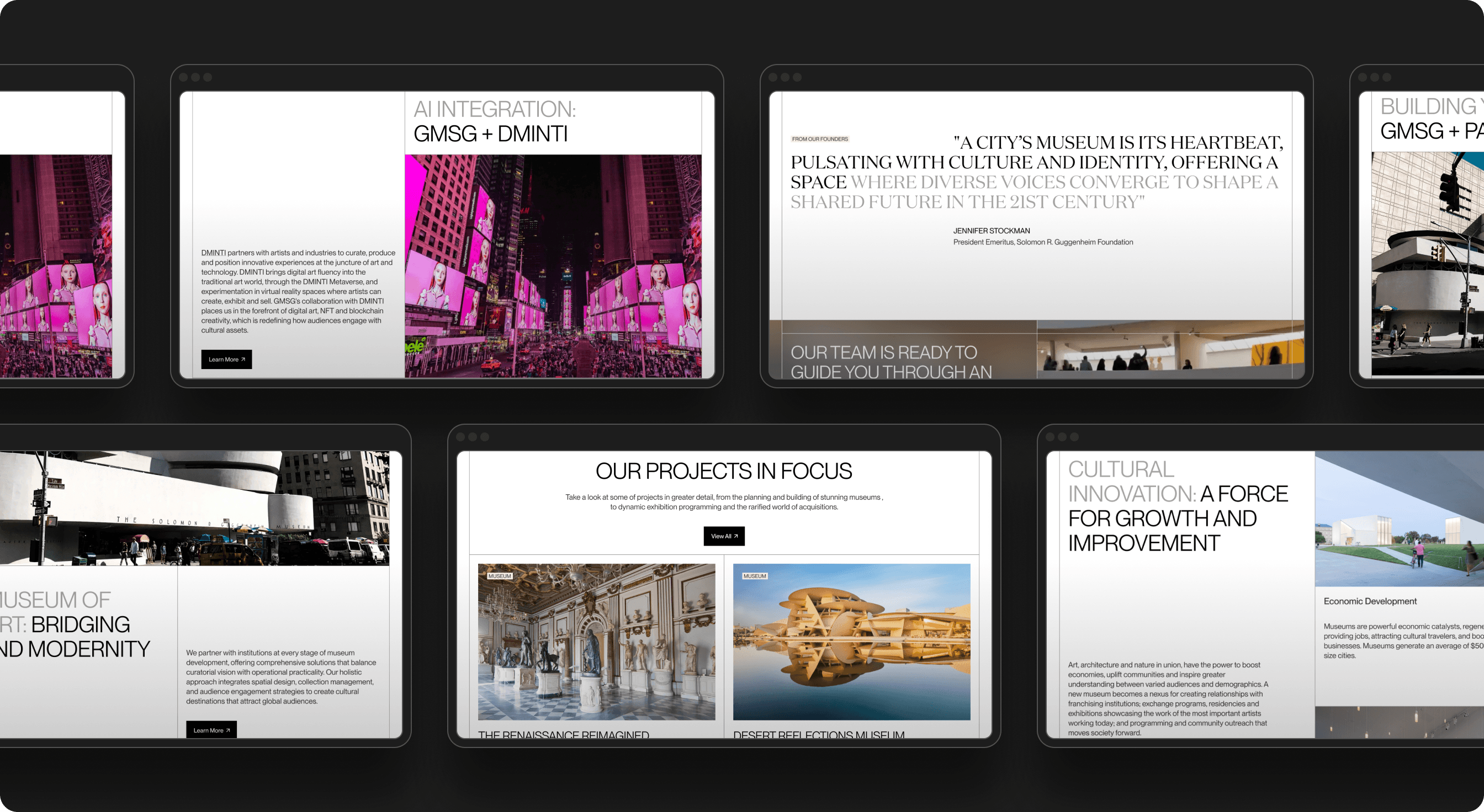The new website positions GMSG as a leader in museum strategy and cultural innovation. It provides a trusted digital presence to engage elite clients, showcase their impact discreetly, and set the stage for their ambitious goal of building globally renowned museums on every continent.